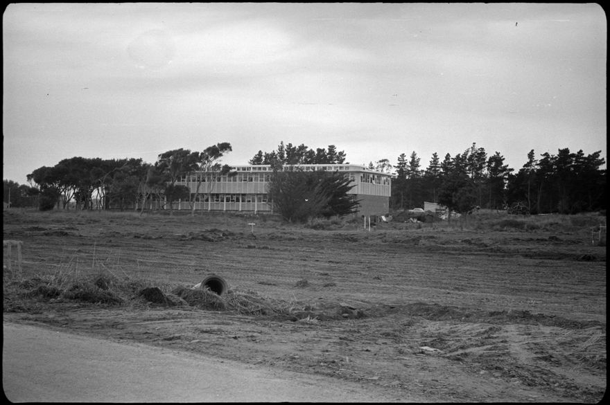 It depicts a building which was later named the Mataamua building. It was the first building constructed for the Teacher's Training College, and was subsequentially earthquake strengthened with a metal frame extending round the exterior. The building was scheduled for demolition when the campus was sold to the Wallace Development Company in 2016. For extensive information on the campus, search for Ben Foster's community uploads in Manawatū Heritage.