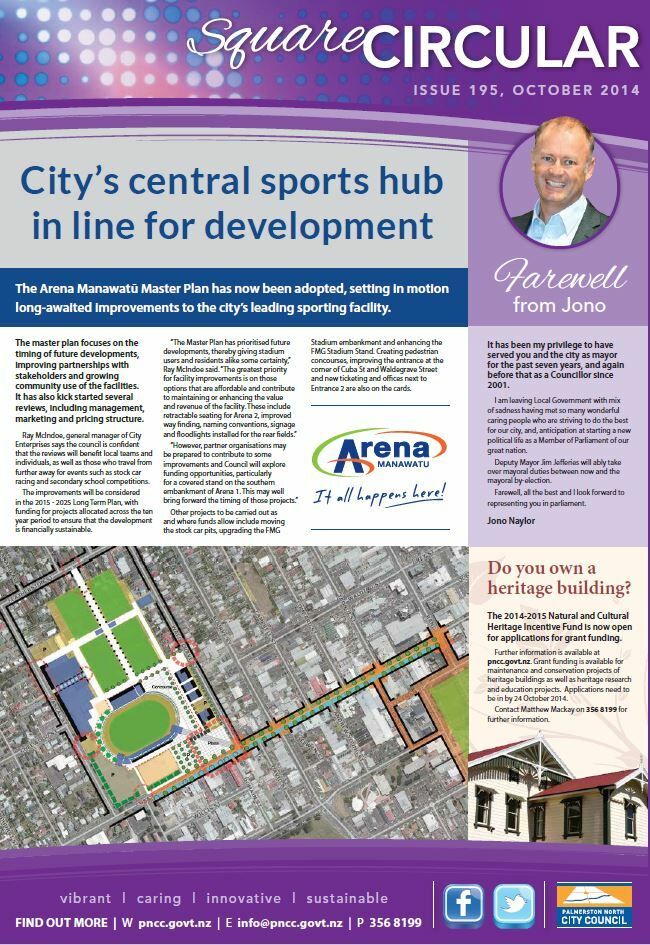 - The Square Circular was Palmerston North City Council's monthly community publication, informing Palmerstonians of PNCC initiatives, activites, and events. This month's issue includes: Arena Manawatu; Jono Naylor; grants; economic report; conservation; civil defence; councillors; Turitea dam; trees; urban design; housing; Victoria Esplanade aviary; councillors; Arapuke Forest Park; Joyce's Little Free Library; Local History Week; Heritage Trust Calendar, committee meetings.