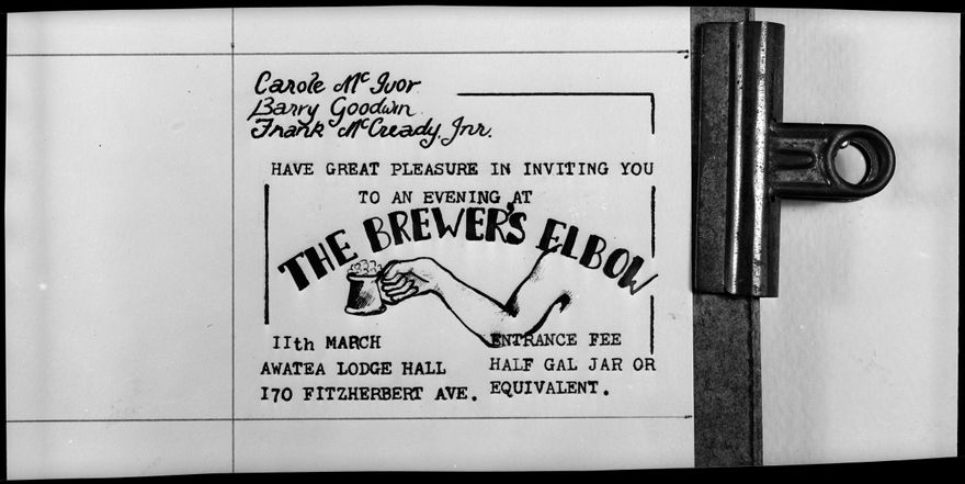 This invitation reads: Carole McIvor, Barry Goodwin, Frank McReady Jnr have the great pleasure in inviting you to an evening at The Brewer's Elbow. 11th March Awatea Lodge Hall, 170 Fitzherbert Avenue. Entrance Fee Half Gal. [gallon] jar or equivalent. This negative comes from the Elmar Collection - a large series of semi-identified and unidentified images from the 1930s-1970s.