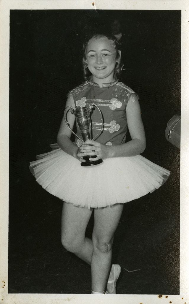 Karen or Leanne Archer dressed in a tutu, holding a trophy