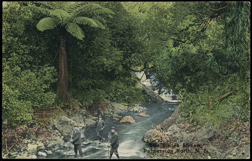 This hand-tinted postcard shows three men hiking through the Turitea Stream.