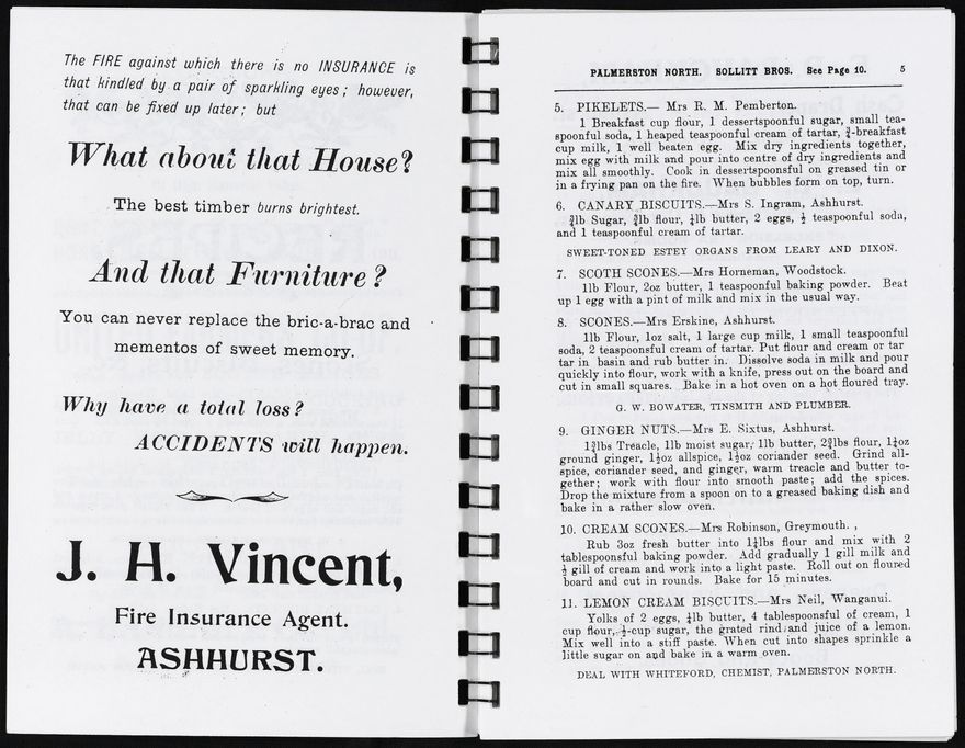 A reproduction of Our Own Cookery Book compiled by Mrs J. West for the Ashhurst Town Band Bazaar. The cook book features community submitted recipes (including the names of contributors) and includes many advertisements of local area businesses.