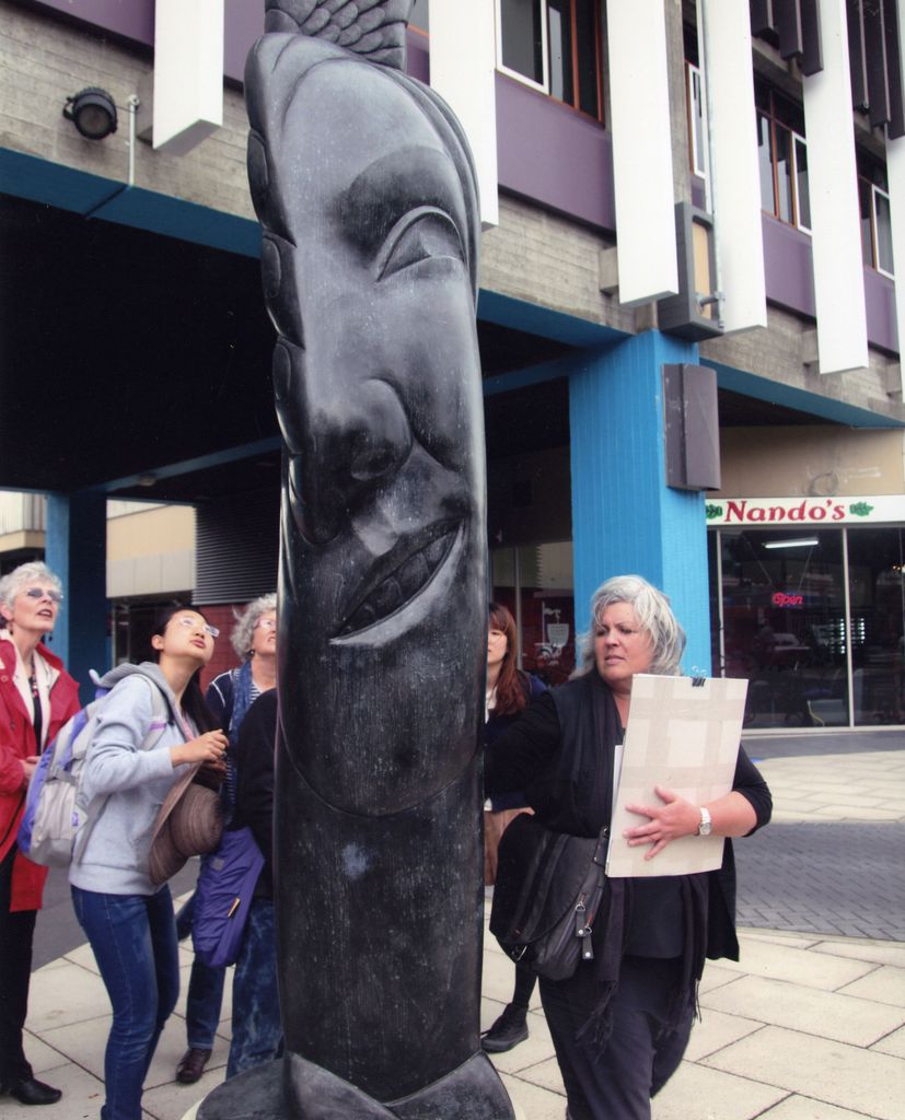 Catherine Russ, at left, of the Palmerston North Sculpture Trust, leads a guided walk around Palmerston North's sculptures during Local History in November 2013.