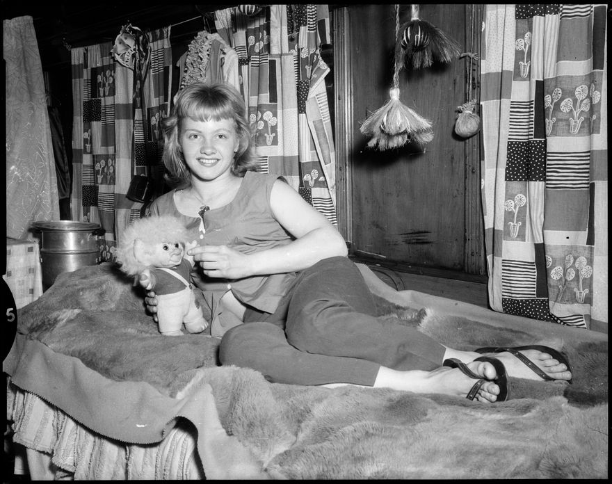 This image was taken for a story that ran in The Manawatu Evening Standard on 31 January 1961: "Miss Mary Sanderson, the petite blonde flying trapeze artist, reclines in her "railway carriage" home. She is lying on an attractive kangaroo skin rug made from kangaroos shot by the company. Clearly visible are the Maori pois, her "lucky tiki" around her neck and the "fisherman's good luck" doll from Australia."