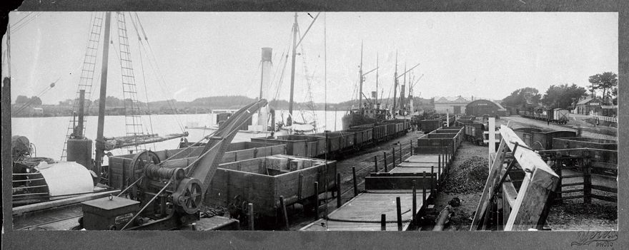 In the foreground are the railway yards and the station building on the far right. To the left of the goods shed is Levin and Companies “Hemp Grading and Wool Stores”, a large white building built in 1907 and destroyed by fire in 1922. It is thought this photo was taken when the river was in flood, and vessels at the port were unable to cross the bar at the mouth of the Manawatu River.