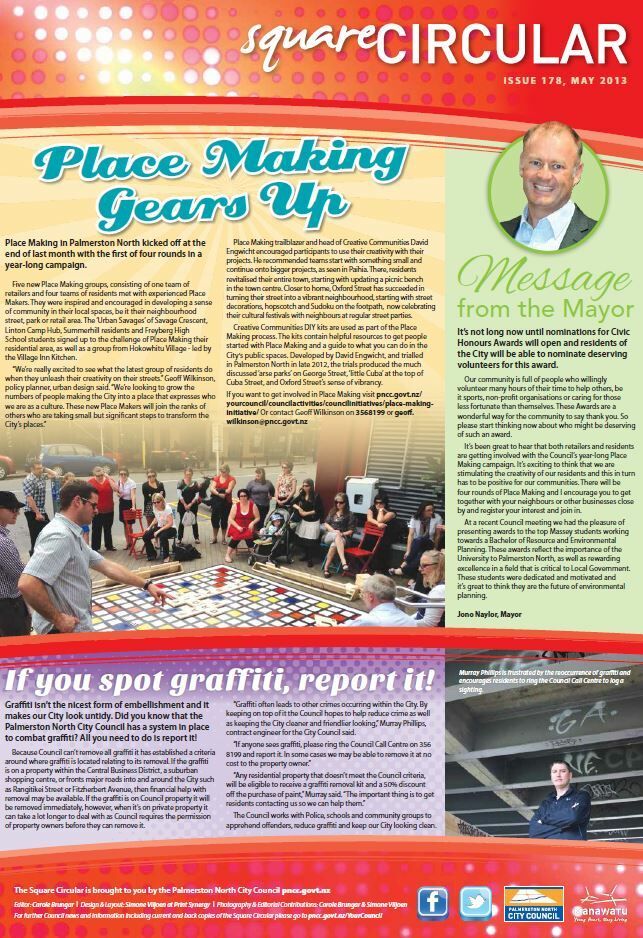 The Square Circular was Palmerston North City Council's monthly community publication, informing Palmerstonians of PNCC initiatives, activites, and events. This month's issue includes: place making; Jono Naylor; graffiti; parks and reserves; Roslyn; awards; Civic Honours Awards; draft community engagement strategy; Caccia Birch; home insulation, draft annual plan; youth space; pulse; recycling; civil defence.
