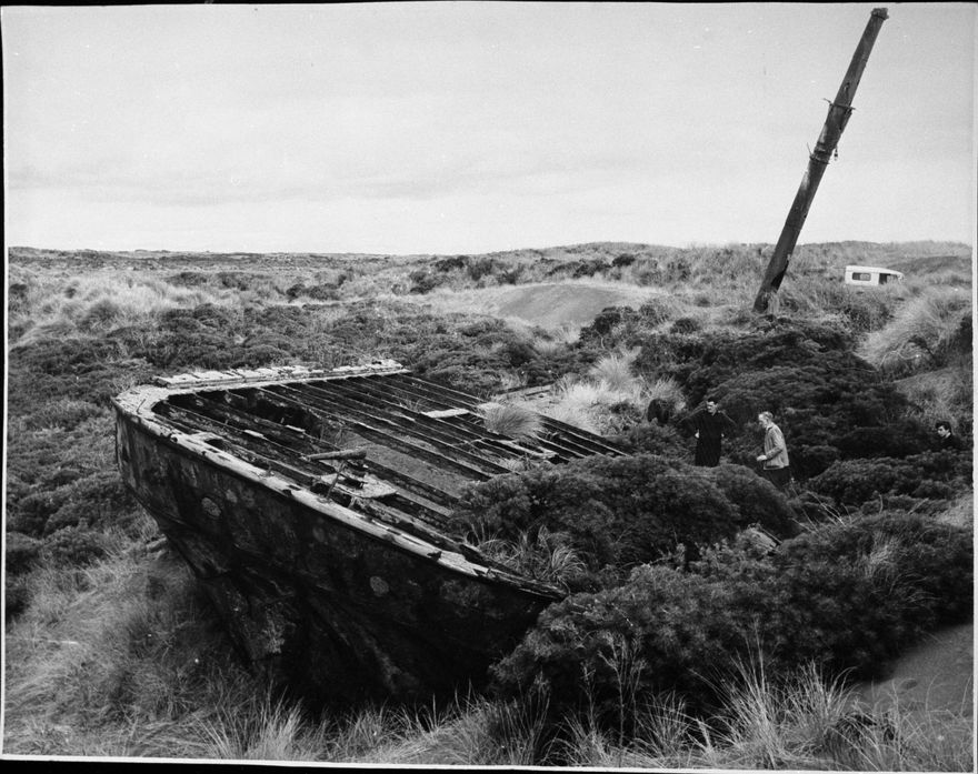 Ingram and Wheatley's book "New Zealand Shipwrecks" relates the story of the "Fusilier", an iron barque of 404 tons net register. She went ashore, between Turakina and Rangitikei Rivers at midday on the 16th January 1884, but no lives were lost. Since 1884, the sand has moved westward and today the remains of the Fusilier are situated behind the first line of sand dunes, about 200 yards from the present high water mark. When this photograph was taken one of the masts was still standing, but by 1965 (when the writer first visited the wreck), this mast had collapsed and was partially buried by sand.