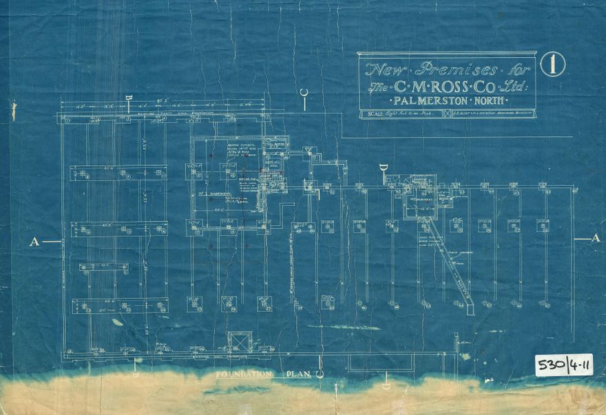 FoundationPlan of the CM Ross Building. In 1927-1928, the new department store was built, replacing the three buildings that comprised C M Ross Co. Ltd on The Square, Palmerston North.
