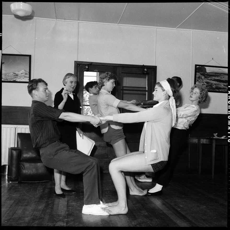 - This image was taken for a story that ran in The Manawatu Evening Standard on 11 January, 1964. " "Up, up, up. Then down to sitting position." Miss Nola Millar (at back) instructs a class doing exercises at the New Zealand Drama Council's Summer School at Massey University. On the left is Mr J. Tattersfield and on the right, Miss L. Cruickshank, both of Invercargill."