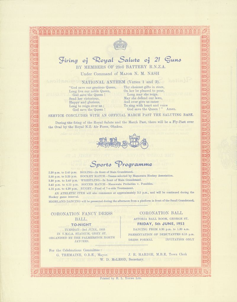 A procession walked to the Palmerston North Showgrounds, where a religous service was held, followed by a 21 gun salute and sports programme, on 2 June 1953. Later that night a Coronation Fancy Dress Ball was held, and a formal Coronation Ball later in the week. The events were organised by the Palmerston North City Council to celebrate the Coronation of Queen Elizabeth II.