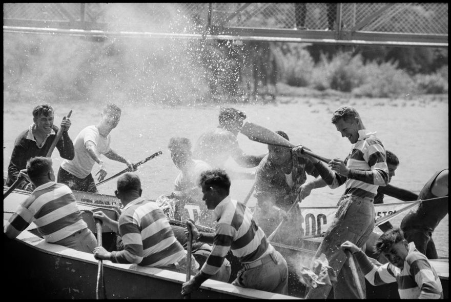 This image was not published in The Manawatu Evening Standard, taken on 21 January, 1964. "During the jousting tournament for the "wooden spoon" at the Carnival of the Lake, between Army and the "Kouncil Knights" disaster overtook the City Council crew. Coming in to attack, they turned broadside on and were dealt a mortal blow by Army. A thunderflash, thrown into the water, exploded under the keel and blew a hole in the plates. looking like a submarine diving, the gondola sank in a dignified dive, leaving the crew floundering in the lake. Navy divers and the Army soon salvaged the stricken vessel." See Also: 2017N_2017-20_018340, 2017N_2017-20_018341, 2017N_2017-20_018342, 2017N_2017-20_018344