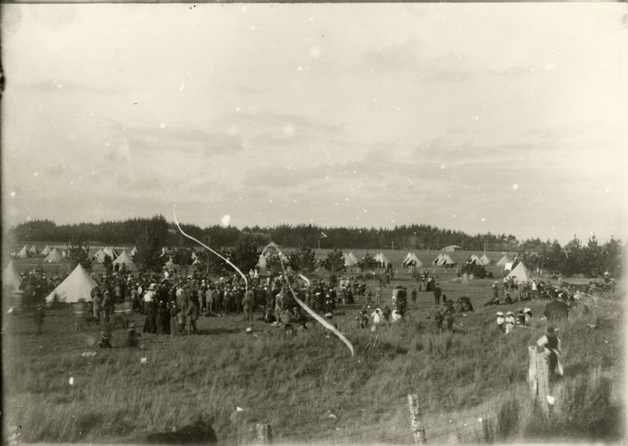 A large crowd of visitors gather at what appears to be a camp of the Rifle Volunteers, possibly in the vicinity of Foxton.
