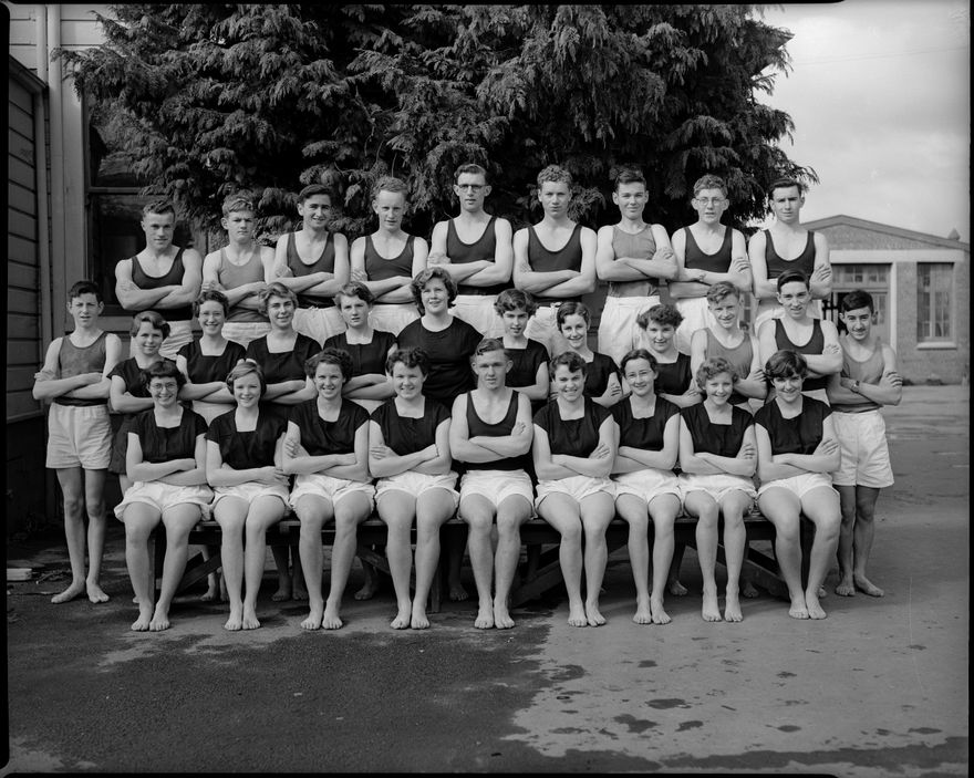 A group of thirty students dressed in their athletics uniforms. The Palmerston North Technical High School was opened in September 1909 on what is now Princess Street, Palmerston North. In 1956 the school moved to the Rangitikei Street site and became known as Queen Elizabeth Technical College. The original building and site is now used by the Universal College of Learning [UCOL]. This negative comes from the Elmar Collection - a large series of semi-identified and unidentified images from the 1930s-1970s.