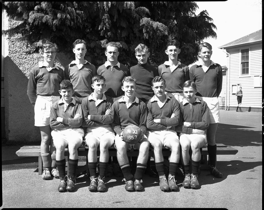 A group of eleven male students pose in their soccer uniforms. The Palmerston North Technical High School was opened in September 1909 on what is now Princess Street, Palmerston North. In 1956 the school moved to the Rangitikei Street site and became known as Queen Elizabeth Technical College. The original building and site is now used by the Universal College of Learning [UCOL]. This negative comes from the Elmar Collection - a large series of semi-identified and unidentified images from the 1930s-1970s.