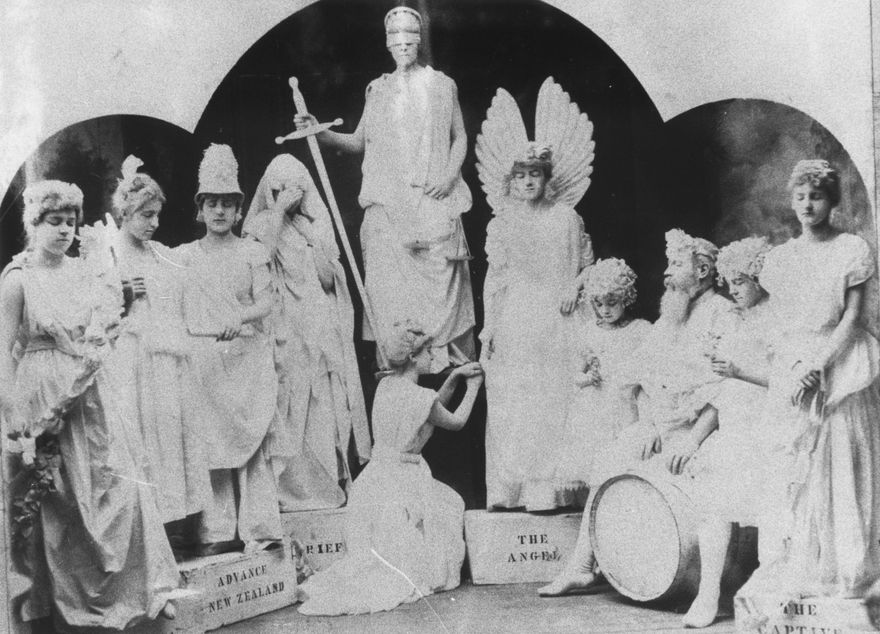 The tableau was part of the entertainment staged at an All Saints Ladies Guild Evening at the Theatre Royal, 12th and 13th of September 1888. The tableau represented a group of statues called 'The Sculptor's Dream' and was lit by coloured lights. The human waxworks are from left: Miss Katherine Keeling as Flora (daughter of Town Clerk, Robert North Keeling); Misses Randolph and McKenzie as Advance NZ; Miss Edith Abigail Margaret Clapperton as Grief; Miss Eva Haynes as Justice; Miss Goulston as Supplication; Miss Mary Jane Bell as the Angel; George Matthew Snelson as Bacchus; Amy Smith and Olive Walkley (married Mr Bailey, daughter of John Walkley of the Commercial Hotel) as the Bacchantes; Miss Lillian Josephine Clapperton as the Captive.