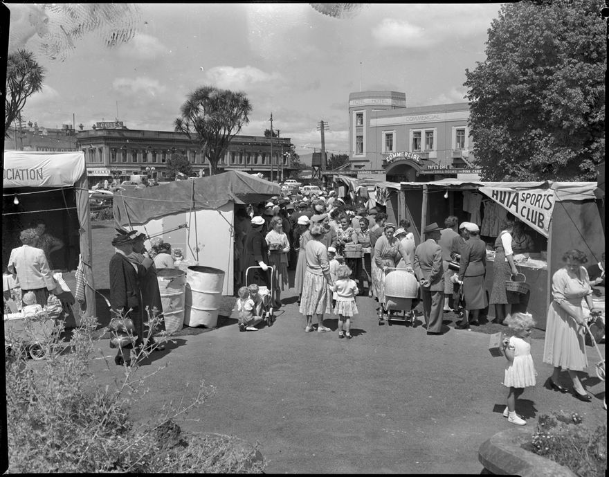 This image was taken for a story that ran in The Manawatu Evening Standard on 31 October 1958: "A section of the large crowd of bargain hunters who early today thronged the section of the Square containing the stalls for the Jaycee Market Day. A wide variety of food, produce, fancy goods and other items were on sale."
