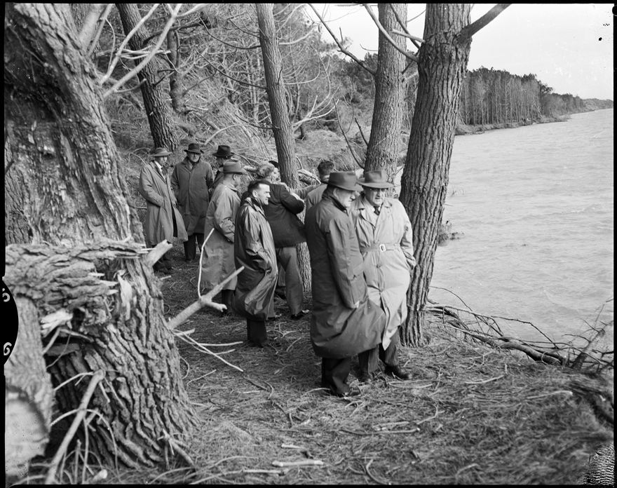 This image was taken for a story that ran in The Manawatu Evening Standard on 5 August, 1959. "The Minister of Works (Mr Watt) is seen yesterday inspecting the rapid erosion at Tangimoana, caused by the swirling waters of the Rangitikei River. In front (second from right) of Rangitikei Catchment Board and Tangimoana Progressive Society officials, Mr Watt collects first-hand evidence to submit a proposal to a subsidy of 3000 pounds to the Soil Conservation Council to help alleviate the problem." Another photo associated with this article was published on the same day.