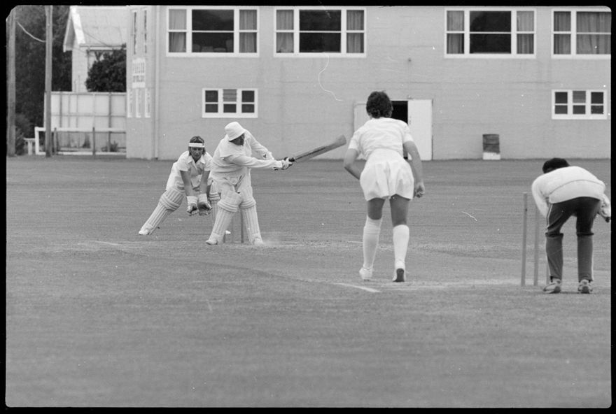 This image was taken (but not published) by the Evening Standard over the weekend of 3/4 January 1981. It depicts a moment of action from the Hallyburton Johnstone Shield 2-day match between the Central Districts women’s side and the Wellington women’s side. Wellington won by 135 runs.