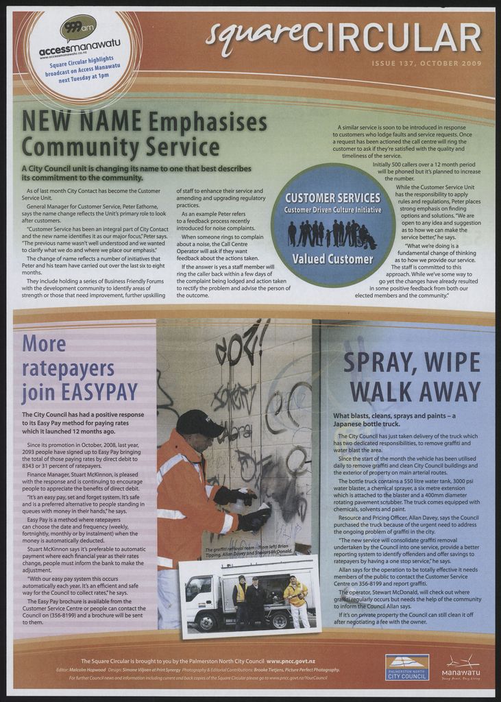 The Square Circular was Palmerston North City Council's monthly community publication, informing Palmerstonians of PNCC initiatives, activities, and events. This month's issue includes: customer service unit, easy pay for rates, graffiti removing truck, energy generation from wastewater treatment, resealing of roads programme, McGregor street reserve, elections, riverside walkway, call centre, next step scholarships, grants for not-for-profit organisations, cultural heritage incentive fund, film at the library, road safety around schools, pony club, The Stomach, Christmas Parade, Te Manawa.