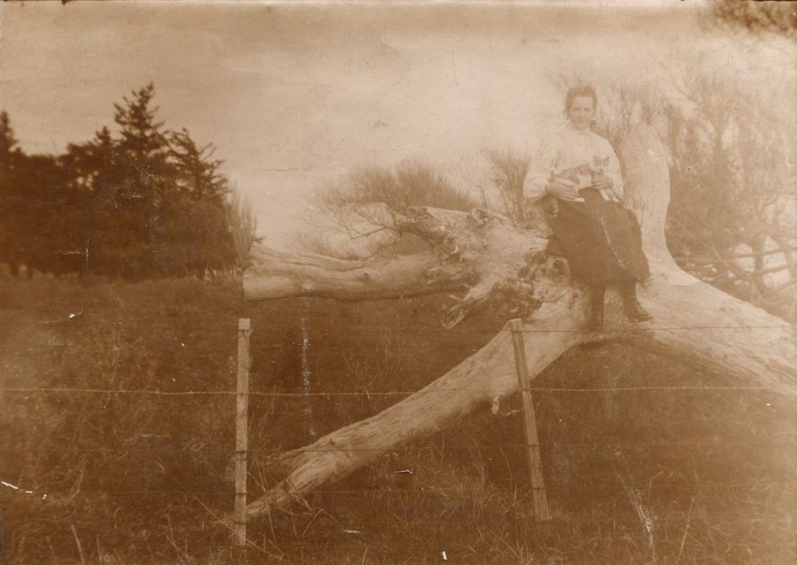 Louisa Jane Chapman (‘Louie’ – then aged about 17), youngest daughter of local sheep and dairy farmer William Chapman, perched with cat on the remains of an uprooted tree in the fields behind the family home on the corner of Boundary Road and Kairanga Road (present-day Tremaine Avenue and Botanical Road). Louie won a scholarship in 1911 to study at Victoria College, Wellington. After qualifying as a teacher and obtaining a B.A. degree in 1917, she received a first teaching appointment at Stratford High School, Taranaki. She died less than a year later, just before Christmas 1918, following an operation she underwent while in hospital in Palmerston North. Her family had learned just a few days earlier of the death of her younger brother, Will, while on active service in France.