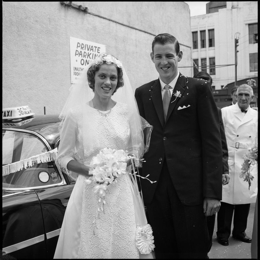 This image was taken for a story that ran in The Manawatu Evening Standard on 26 January, 1964. "Mr And Mrs Michael Godfrey look pleased as they alight from their bridal car after their marriage on Saturday. They had been escorted from All Saints' Church by the Palmerston North Pipe Band. The bride, formerly Miss Anne Harris, daughter of Mr and Mrs G. S. Harris, of Park Road, has been both a piper and drum-major in the band. The bridegroom, Mr Godfrey, is the son of Mrs G. E. Beere and the late Mr R. Godfrey, of Wellington.] See also: 2017N_2017-20_018361, 2017N_2017-20_018362, 2017N_2017-20_018360, 2017N_2017-20_018363
