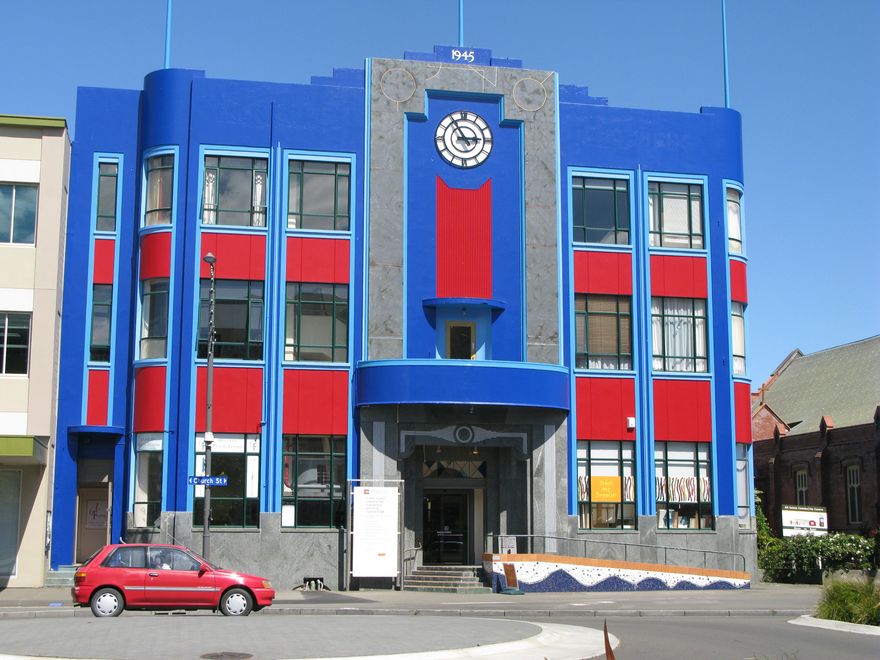 The former Municipal Chambers became an arts centre, known as ‘Square Edge’ when it was vacated by the Palmerston North City Council in 1980. Built as the Palmerston North City Council Municipal building in 1944-1945, it was designed by Reginald Thorrold Jaggard. The Council had occupied the same site in the former Colonial Bank of New Zealand building until it was demolished to make way for their new offices. It retained the 1924 addition (which contained the Council Chamber) at the rear. The building was repainted in 2010.