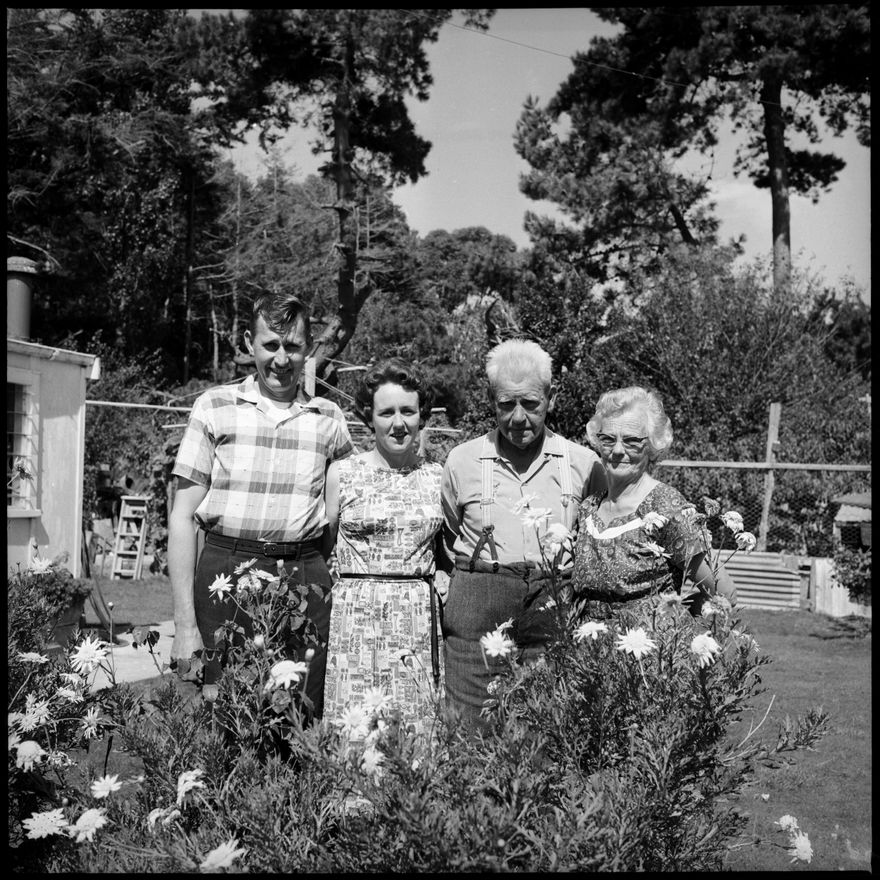 This image was taken for a story that ran in The Manawatu Evening Standard on 15th February 1963. "Mr and Mrs D. Manchester, of Indiana, United States, took the opportunity, while in New Zealand, of visiting Mrs Manchester's parents in Palmerston North (Mr and Mrs P. Smith). Mrs Manchester met her husband while he was a serving Marine in New Zealand during the war. In 1947 she went to Indiana where they were married. The main purpose of their trip was to attend the memorial opening of the Memorial Gates at McKay's crossing. From left: Mr and Mrs D. Manchester and Mr and Mrs P. Smith."
