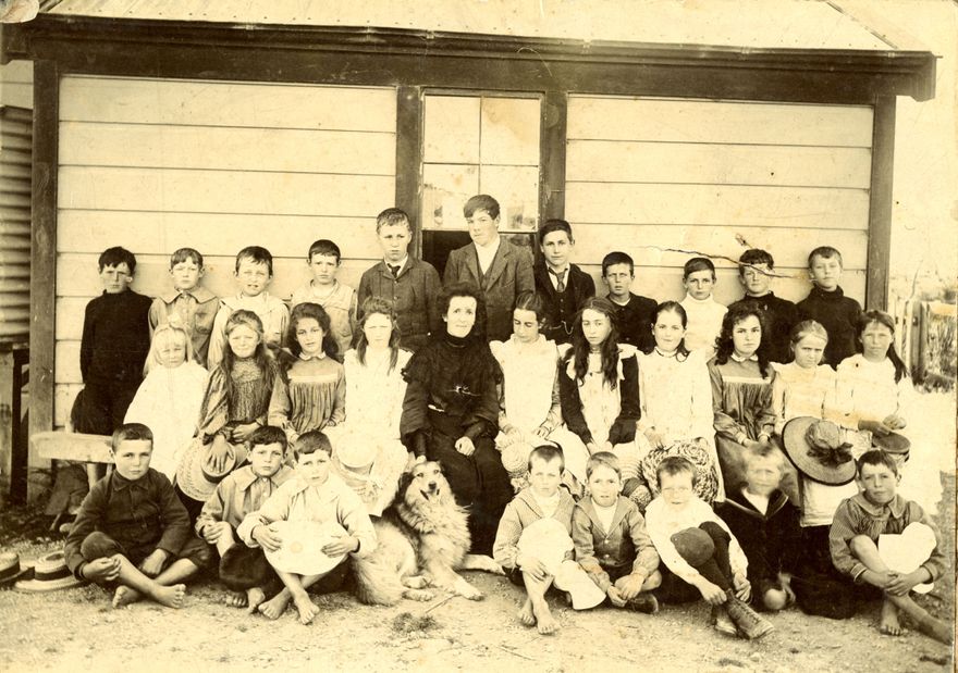 Pupils with teacher, Miss Walton, at Tiritea School. Photograph may contain children of James and Harriet Davis, who farmed in the area until c1897-1910.