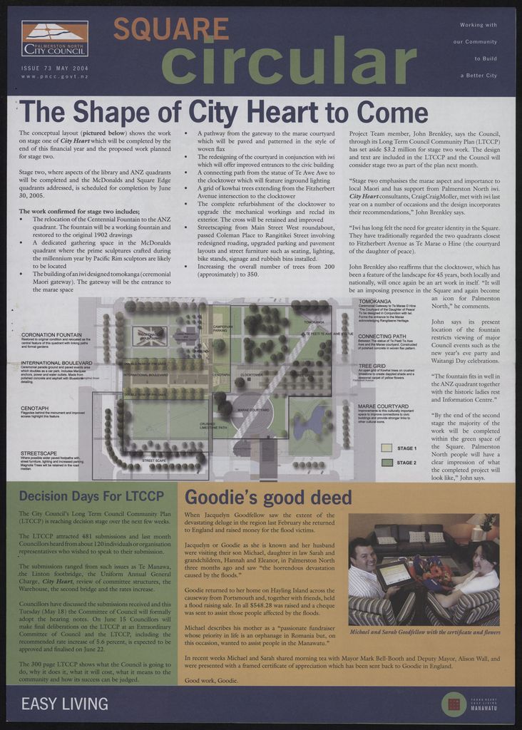 The Square Circular was Palmerston North City Council's monthly community publication, informing Palmerstonians of PNCC initiatives, activites, and events. This month's issue includes: Arena 2; Te Manawa; mobile library; emergency operations centre; wastewater treatment plant; cycle lanes; City Heart; The Square; Long term community plan; building regulations; bylaws; dog control; Reuters independence games.
