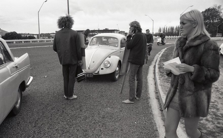 This image was taken (but not used) for a story that ran in The Manawatu Evening Standard on the 8th of May 1970. "These two Massey students are part of the groups which today picketed the university calling for a boycott of lectures to protest against the shooting of students at Kent University, Ohio. They are seen distributing leaflets to Motorists driving up to the university"