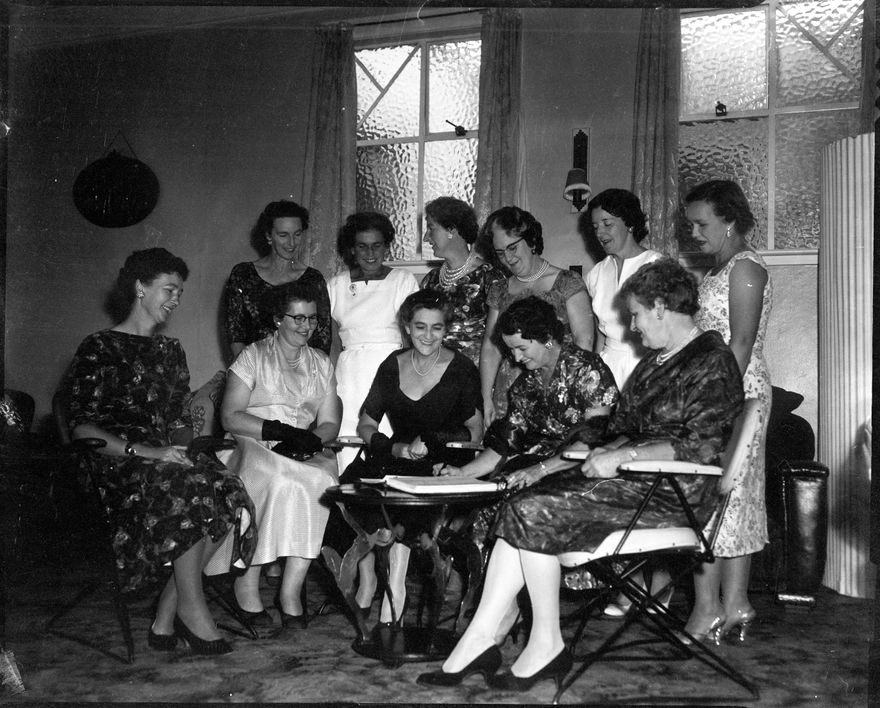 This image was taken for a story that ran in The Manawatu Evening Standard on 13 March 1961 "Mrs. P. Robinson is shown signing the register at the Palmerston North Lions Club anniversary dinner on Saturday night. The function was the first anniversary of the club to which 24 members and their wives were invited."