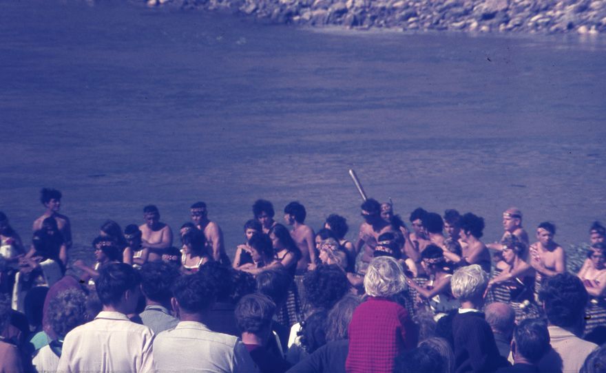 This image compliments a story that ran in The Manawatu Evening Standard on 13th March 1971 "It might have been 100 years ago, but this was the scene in Palmerston North this morning. Mr. and Mrs. G.M. Snelson and their 16-year-old ward Matilda Montgomery..." [Groups of Māori in traditional dress gather at the river bank, as part of the re-enactment of the Snelson's canoe landing from 1871.]