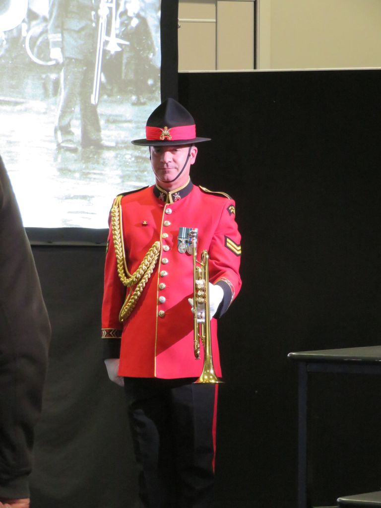 A member of the New Zealand Army Band in his dress uniform and with his bugle, at the announcement of the Military Tattoo to be held in Palmerston North. This event was attended by many from Linton Army Camp and Ohakea Air Base in the Manawatū along with Council representatives and interested parties.