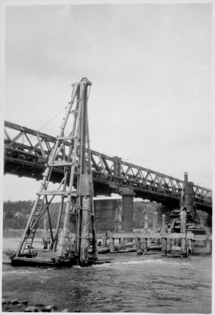 This photograph shows a pile driver in use during the construction of the second Fitzherbert Bridge. This bridge was in use until 1986 when the third Fitzherbert Bridge, still in use today, was constructed due to increasing traffic constraints. It spans the Manawatu River.