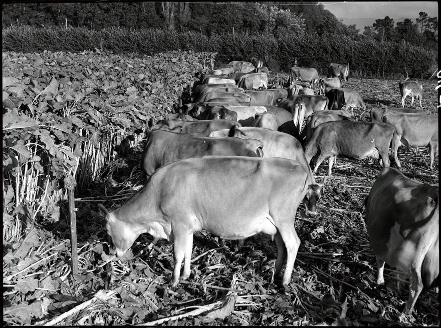 Cows belonging to Massey Agricultural College clean up a field of crops recently harvested.