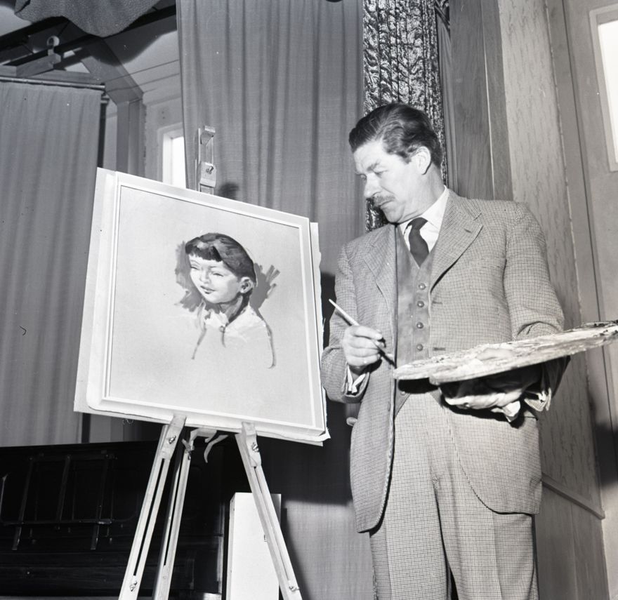 This image was published in the Manawatu Evening Standard on 24 June 1964 with the caption, "New Zealand artist Peter McIntyre looks intently at a painting he has just completed during a demonstration and talk to the Palmerston North Coffee Club at the Lutheran Hall yesterday. "In this mechanised age, the world is rapidly turning into a nightmare," he said. "As a result, people are turning to the arts for comfort. Mechanical devices are being taken for granted and individuals want something more personal. The world's beauty of the countryside is fast being whittled away by industry and because of this, more and more turn to the arts." McIntyre, from Dunedin, studied at London's Slade School of Art. During the Depression he painted backdrops for theatres and worked as an artist on women's magazines but it was as a World War Two professional war artist in Crete, Greece, the Western Desert and Italy that he became famous."