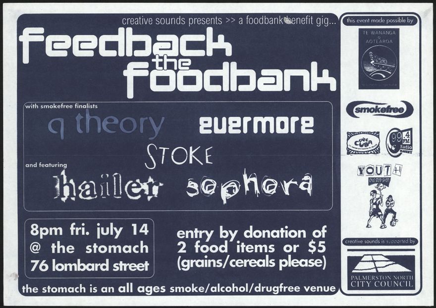 Creative Sounds presents; a foodbank benefit gig. With Smokefree finalists Q Theory, Evermore. And featuring Hailer, Sophora. 8pm fri. july 14 @ the stomach 76 lombard street. Entry by donation of 2 food items or $5 (grains/cereals please). The stomach is an all ages smoke/alcohol/drugfree venue. The event made possible by Te Wananga o Aotearoa, Smokefree, Cafe Cuba, 99.4 FM Radio Massey, Youth One Stop Shop. Creative Sounds supported by Palmerston North City Council.