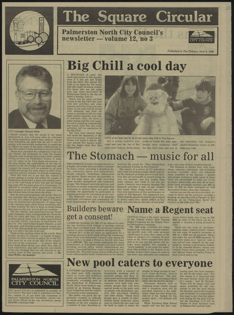 The Square Circular was Palmerston North City Council's monthly community publication, informing Palmerstonians of PNCC initiatives, activites, and events. This month's issue includes: Michael Willis; mid winter festival; Library opening; The Stomach; Regent theatre; art gallery; arts recycling centre; Science centre and Manawatu museum; Freyberg pool; building regulations; waste management; speed limit regulations; parking; survey; meetings.