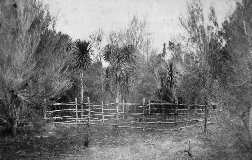 Property of Bishop Monrad, former Prime Minister of Denmark and family. Translated from Danish on rear of photograph, and written by Olga Monrad, daughter in law of Bishop Monrad: ”The little enclosure where my little boy is buried. We have made it smaller and the fence tighter to guard against the sheep, and have planted flowers. It is situated close by the lagoon [to the right]. The fine trees that seem leafless are manuka. The leaves look like myrtle, but [are] very fine, like a cloud, and yet foliage, at Yuletide [is] snow white with myrtle like flowers. It is on this side of the lagoon. When standing in the garden [back] door you face it. At the end of the garden is the sheep lain (paddock) surrounded on all sides by the lagoon.” The little boy spoken of was Arne, second son of Viggo, Bishop Monrad older son, and his wife Olga. Arne died on 14th April 1868 aged two weeks.