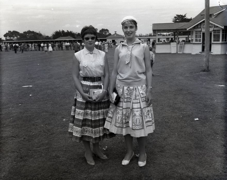 This photograph was taken by the Manawatu Evening Standard to illustrate fashion, but it was not used. The women are unidentified, but the location appears to be the Woodville Racecourse.