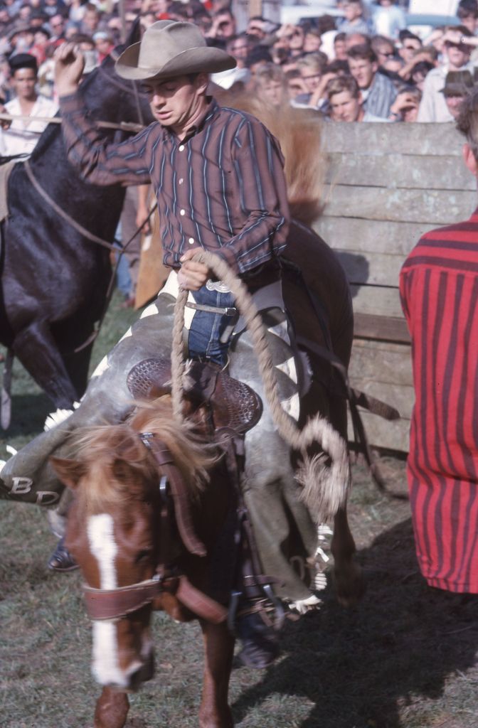 Cowboy riding a bronc (horse trained to buck in a rodeo setting) at the Linton Rodeo.