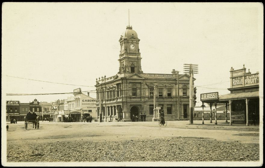 A postcard of the newly built Chief Post Office on the corner of The Square and Main Street East. Built in 1906, the Post Office on the corner of The Square and Main Street was Palmerston North’s fourth, and replaced a small wooden building on the same site. In 1988, when Telecom and Postbank became separate entities, the building ceased to be the Post Office. It currently operates as a restaurant and bar.