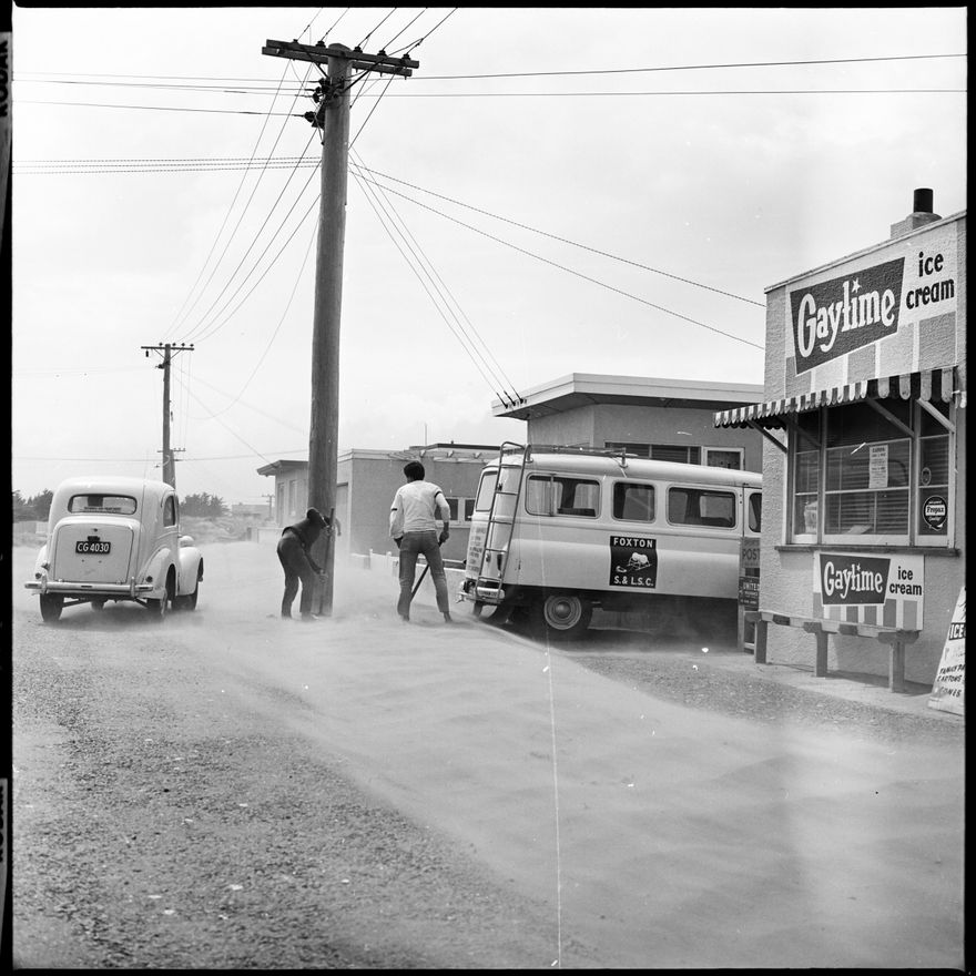 This image was taken for a story that ran in The Manawatu Evening Standard on 28th December 1965 "Rough seas aggravated by a gale force wind lashed some inland at Foxton Beach today. The members of the Foxton Life-saving Club had to shovel sand away from the club's driveway before they could drive the surf life-saving van out. Sand carried by the strong wind had built up along the edges of the road causing difficulty to some motorists. They wind was one of the strongest experienced at the beach for some time."