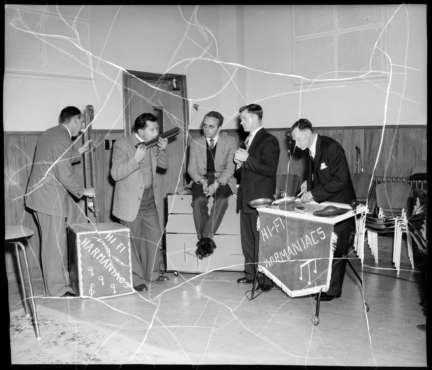This image was taken for a story that ran in The Manawatu Evening Standard on 13 July 1961 "Last evening the vising harmonica virtuoso Larry Adler was entertained by a local harmonica group. Mr. Adler seated himself on the electric cabinet and enjoyed the impromptu concert. At the conclusion Mr. Adler offered the group suggestions, but said that he had little criticism to make."
