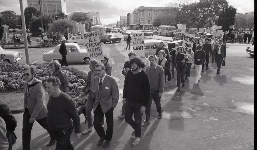 "More than 200 anti-Vietnam war demonstrators marched quietly and solemnly along Broadway Avenue in Palmerston North shortly after noon yesterday, carrying a dozen black-draped coffins designed to symbolise the 28 New Zealanders killed in the Vietnam War.