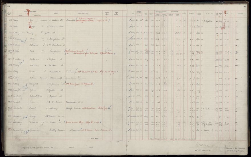 Palmerston North Borough Council rate book, listing rate payers for the years (1 April - 31 March) 1920 - 1921. Gives names, street, owner (if different to rate payer), legal description of property, capital and unimproved values and rates paid.