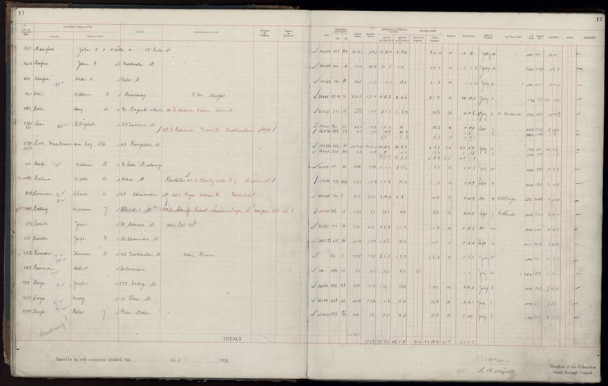 Palmerston North Borough Council rate book, listing rate payers for the years (1 April - 31 March) 1920 - 1921. Gives names, street, owner (if different to rate payer), legal description of property, capital and unimproved values and rates paid.