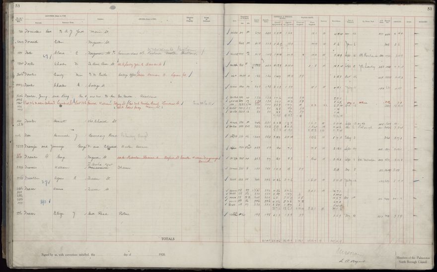 Palmerston North Borough Council rate book, listing rate payers for the years (1 April - 31 March) 1920 - 1921. Gives names, street, owner (if different to rate payer), legal description of property, capital and unimproved values and rates paid.