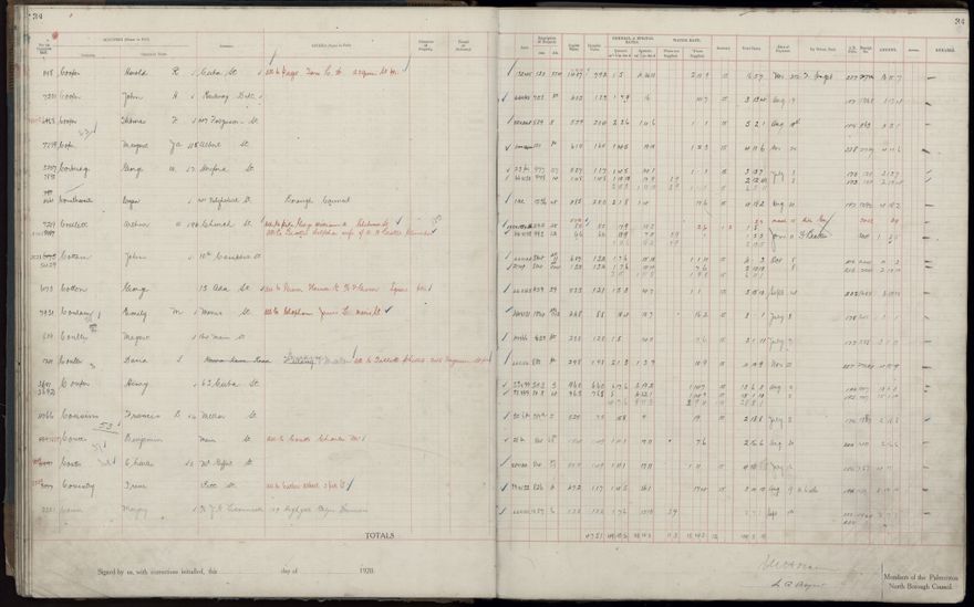 Palmerston North Borough Council rate book, listing rate payers for the years (1 April - 31 March) 1920 - 1921. Gives names, street, owner (if different to rate payer), legal description of property, capital and unimproved values and rates paid.