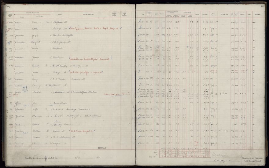 Palmerston North Borough Council rate book, listing rate payers for the years (1 April - 31 March) 1920 - 1921. Gives names, street, owner (if different to rate payer), legal description of property, capital and unimproved values and rates paid.